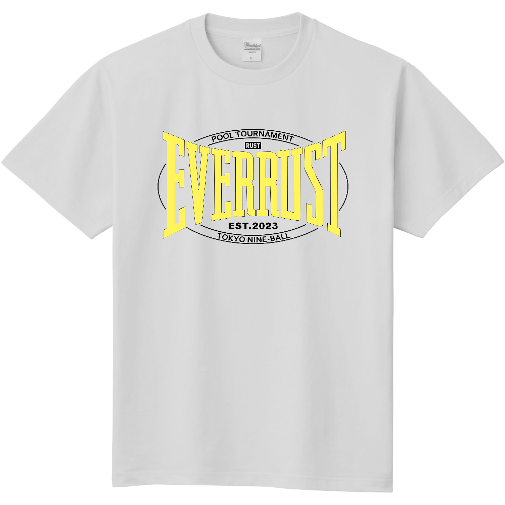 ネオンイエローのコントラストが映える、 RUSTのテーマのひとつ “TOKYO 9-BALL” をカレッジTライクなデザインに仕上げた作品。